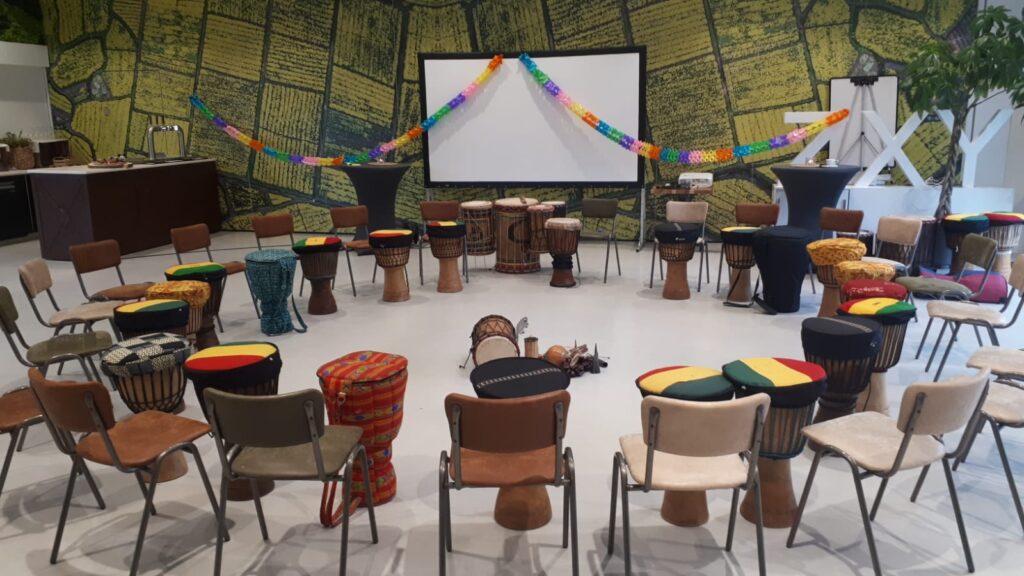 Leuke, ontspannen, ongedwongen en energievolle teambuildingssessie! Sebastiaan van Afrika Percussie neemt een scala aan instrumenten mee, creëert een ontspannen sfeer en geeft geanimeerd ‘les’